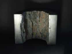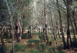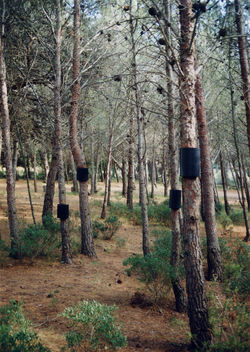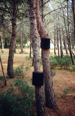 Des demi-cylindres composés de résine synthétique et de carbone sont appliqués sur des troncs de conifères. Cette essence de pin à croissance rapide subit une importante desquamation de l'écorce pendant la période d’été. Les dimensions et le nombre des éléments sont fonction de l’emplacement et de la taille du support végétal. Groupés plutôt que répartis, ces modules de forme mécanique et de couleur gris noir métallescent, tous orientés dans la même direction, s'opposent sans violence à l’environnement. À terme, ils sont rejetés par la pousse des arbres et deviennent alors le relevé d’un stade éphémère, à la fois unique et sans cesse renouvelé du cycle naturel.